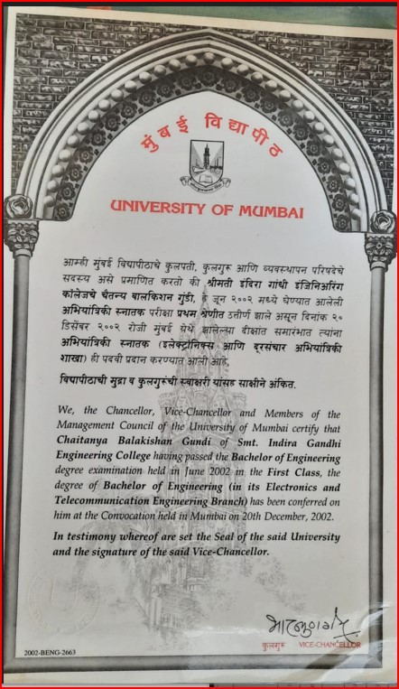 - B.E. (Electronics and Telecommunications) from University of Mumbai, India