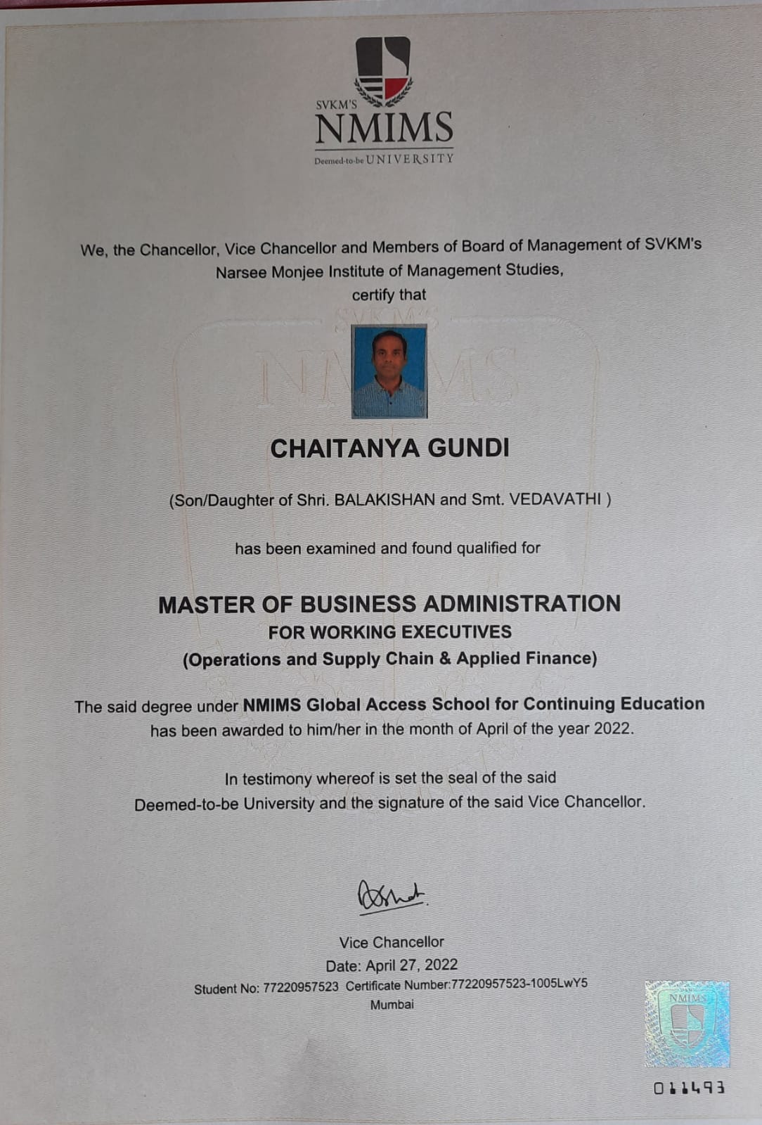 - MBA in Supply Chain & Operations and Applied Finance from NMIMS, Mumbai, India