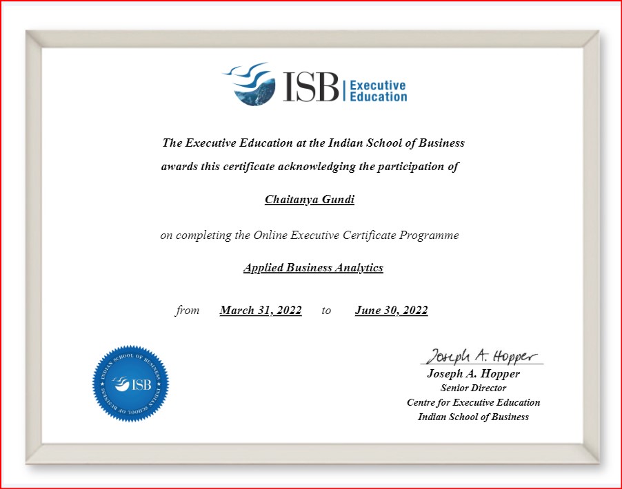 - Certificate in Applied Business Analytics from ISB, Hyderabad